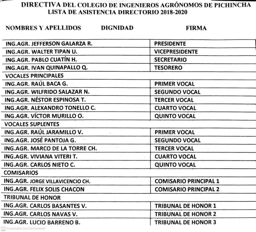 Directiva 2018–2020 del Colegio de Ingenieros Agrónomos de Pichincha, gestión que se destacó por su compromiso institucional y su aporte al fortalecimiento del gremio agronómico.