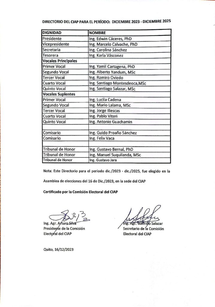 El Colegio de Ingenieros Agrónomos de Pichincha presenta su Directorio correspondiente al período Diciembre 2023 – Diciembre 2025.